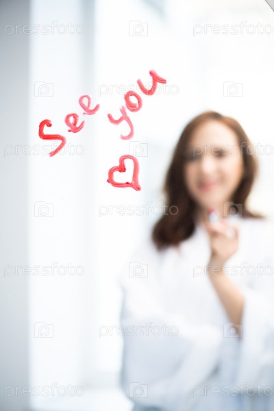 Брюнетка в белом халате стоит перед зеркалом с любовным посланием