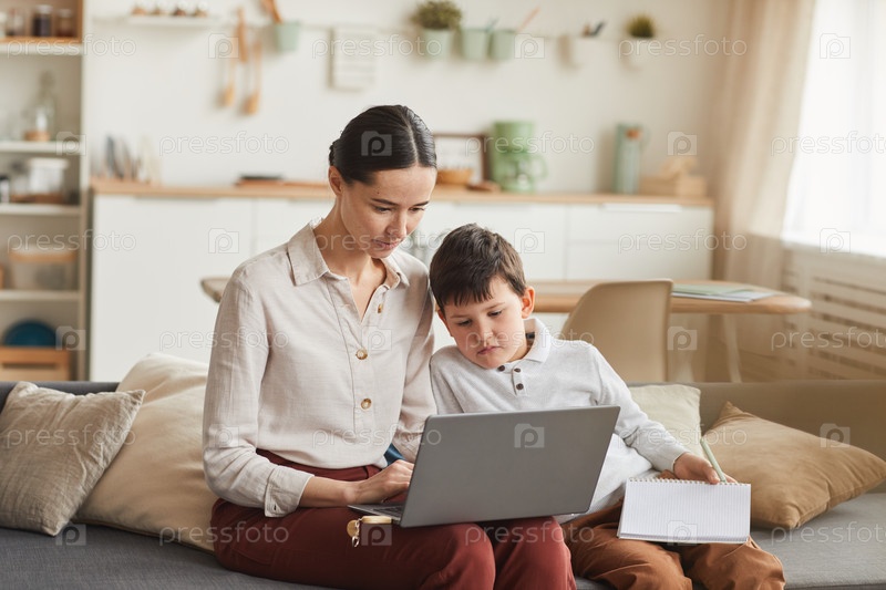 Мать и сын используют ноутбук во время учебы дома