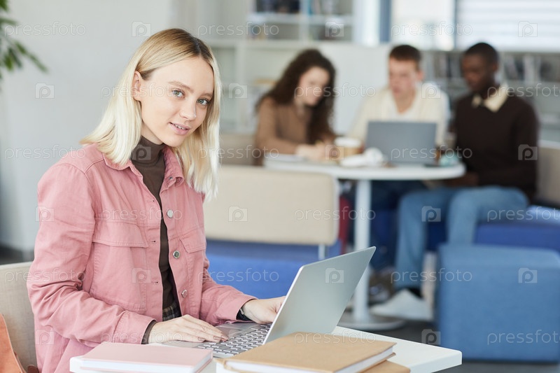 Улыбающаяся студентка использует ноутбук в библиотеке