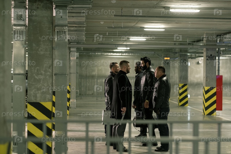 Две группы межкультурных мужчин с пистолетами взаимодействуют на стоянке