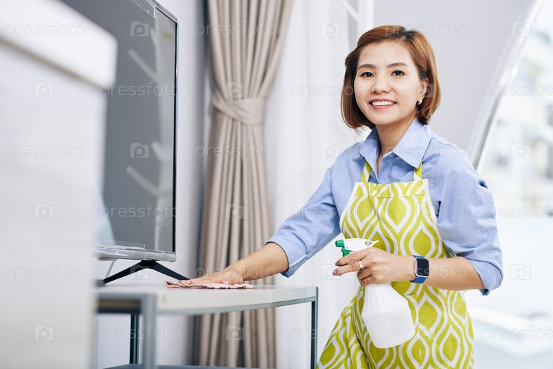 Домашняя хозяйка, стирающая пыль