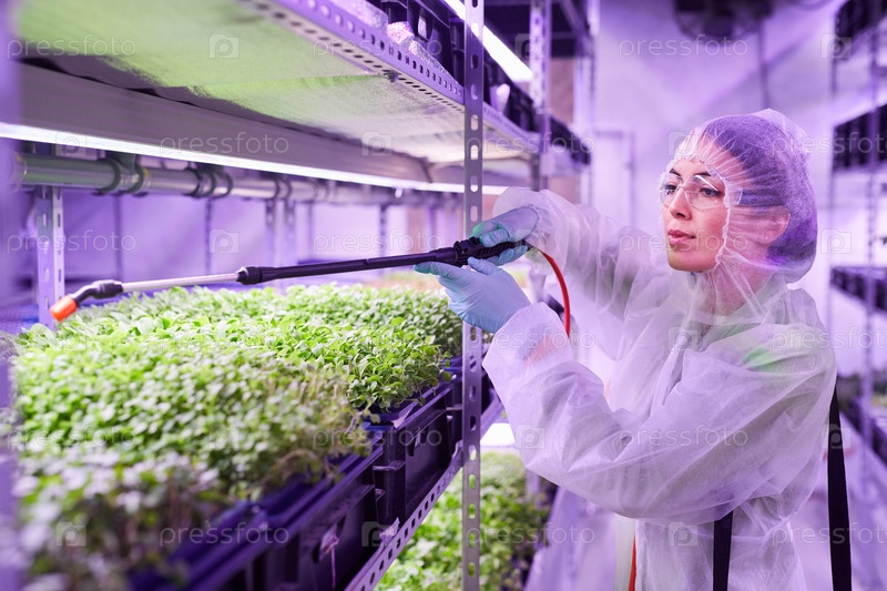 Улыбающаяся женщина-работница удобрения растений на плантации