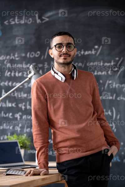 Молодая уверенная в себе IT-менеджерка в повседневной одежде и очках стоит на рабочем месте