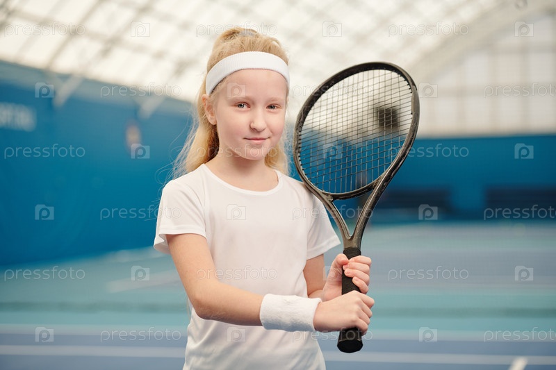Милая блондинка в белом спортивном костюме, держащая теннисную ракетку за плечо