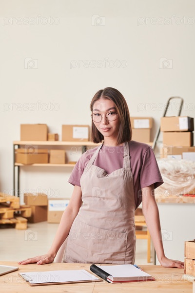 Портрет улыбающейся азиатской девушки с коричневыми волосами, прислонившейся к столу со скатертью и блокнотом на складе магазина