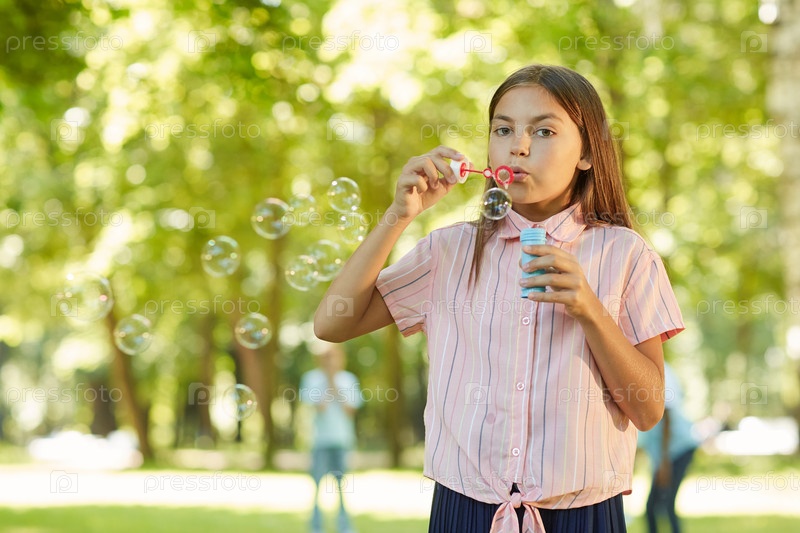 Подростковая девушка дует мыльные пузыри на открытом воздухе