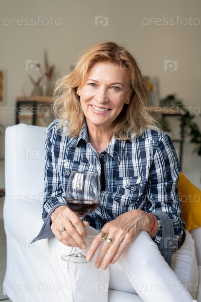 Веселая блондинка зрелая женщина со стаканчиком вина смотрит на тебя с зубчатой улыбкой