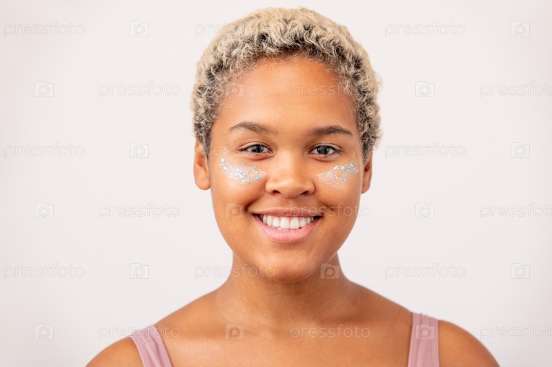 Счастливая молодая африканская женщина с маской внизу и зубчатой улыбкой смотрит на тебя