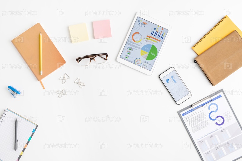 Верхний вид материалов офисного работника, включая финансовые бумаги в клипборде