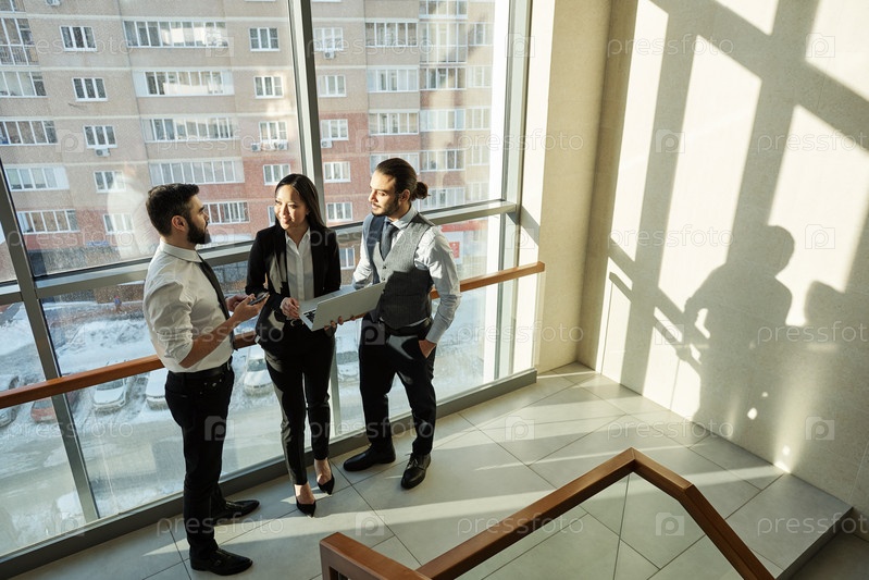 Группа из трех молодых современных аналитиков в формальной одежде обсуждает онлайн-данные