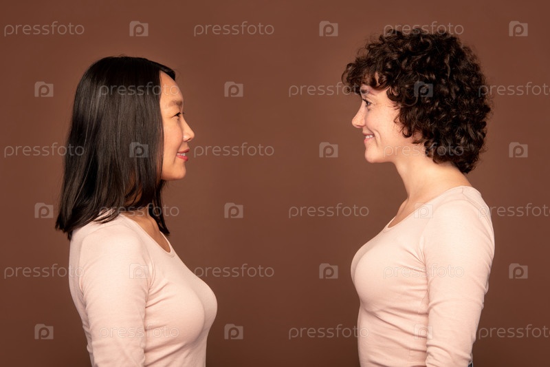 Боковой вид двух веселых молодых девушек азиатского и этнического происхождения