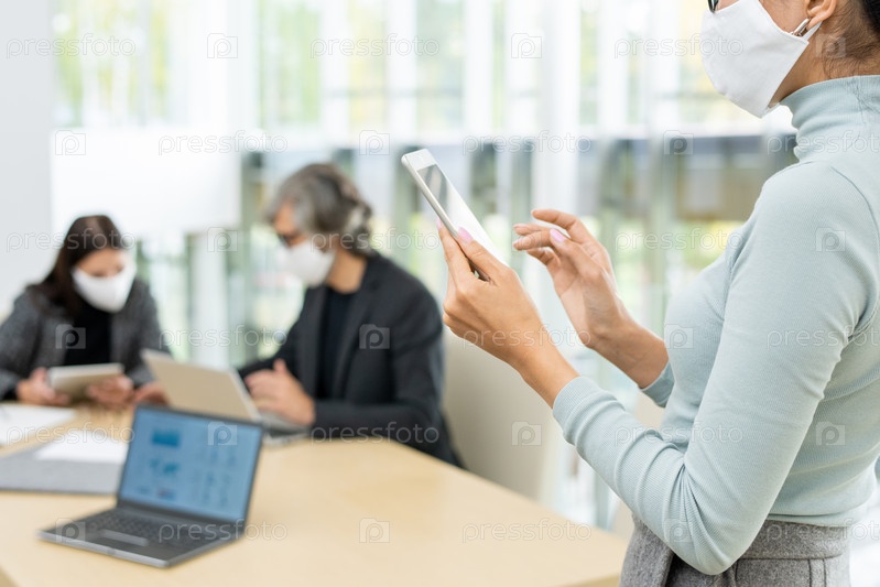 Молодая деловая женщина в повседневной одежде и защитной маске прокручивает на сенсорной панели