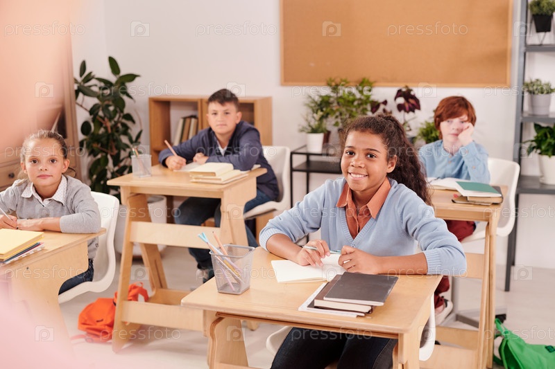 Счастливые межкультурные ученики средней школы смотрят на учителя во время урока