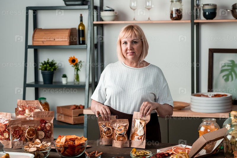 Счастливая блондинка-домохозяйка в белой футболке, показывающая упаковки домашних сухих фруктов