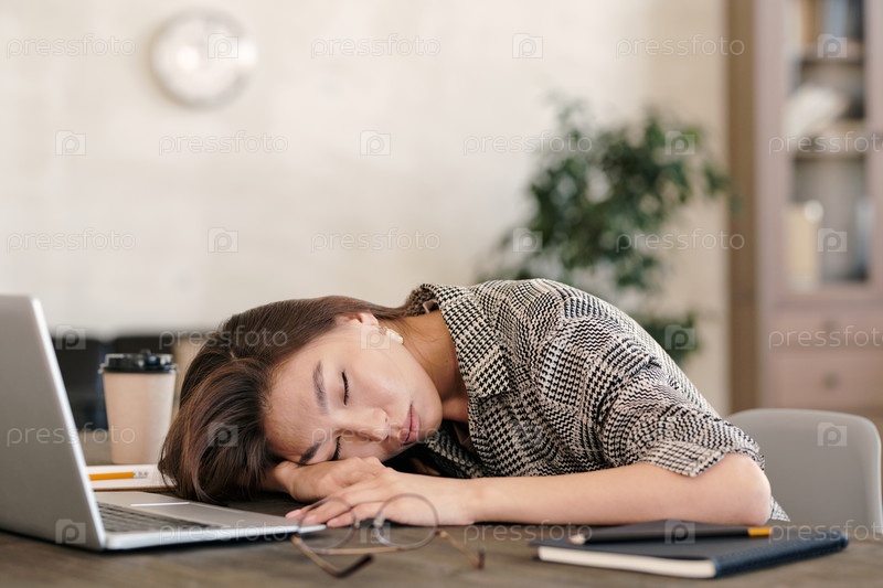 Молодая измученная бизнесвумен в формальной одежде держит голову на руке во время сна