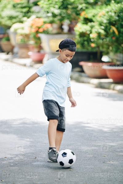 Мальчик отскакивает с футбольным мячом