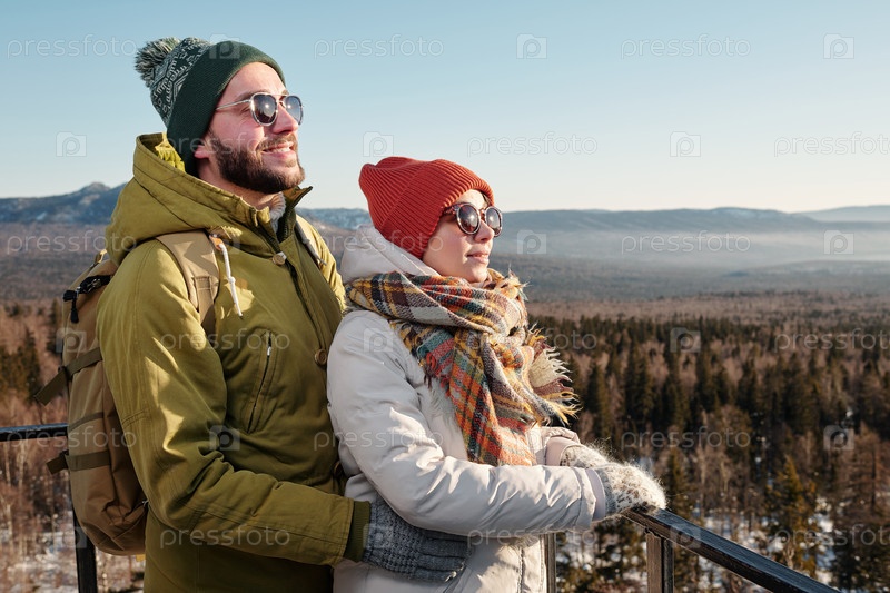 Боковой вид счастливых молодых свиданий в зимней одежде и солнцезащитных очках, смотрящих вперед