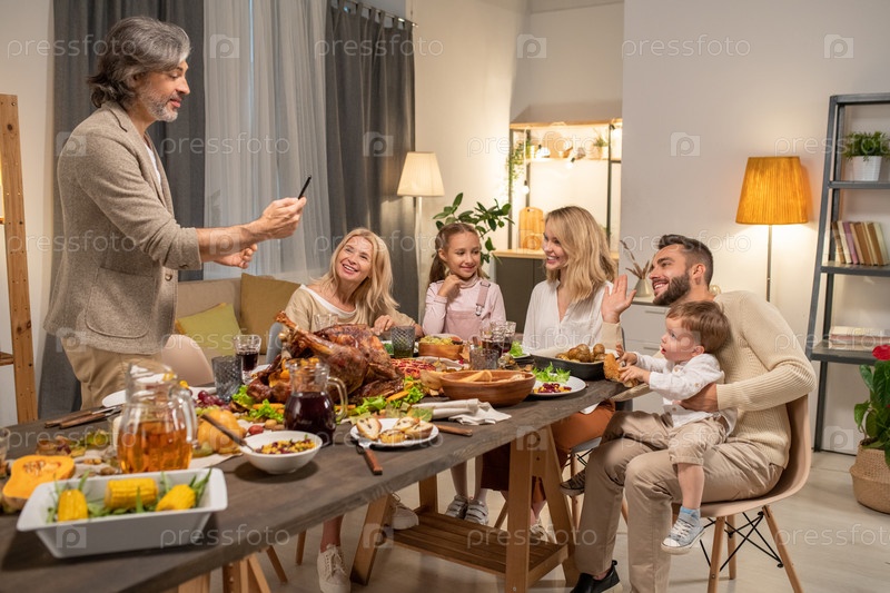 Зрелый мужчина со смартфоном фотографирует свою большую семью за ужином