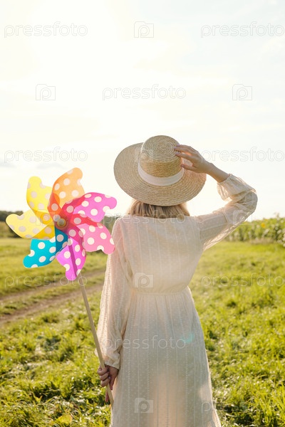 Задний вид молодой элегантной женщины в шляпе и белом платье, наслаждающейся летним днем