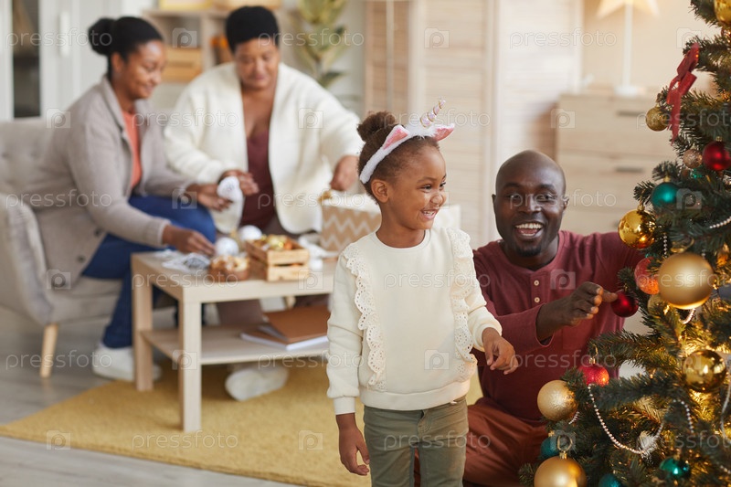 Афроамериканская семья украшает Рождество