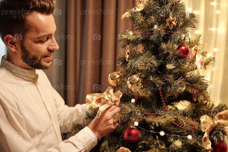 Счастливый молодой бородатый мужчина в белой рубашке ставит декоративный лук на рождественскую елку