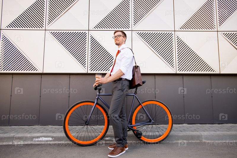 Счастливый элегантный молодой человек с велосипедом, стоящим в городской среде