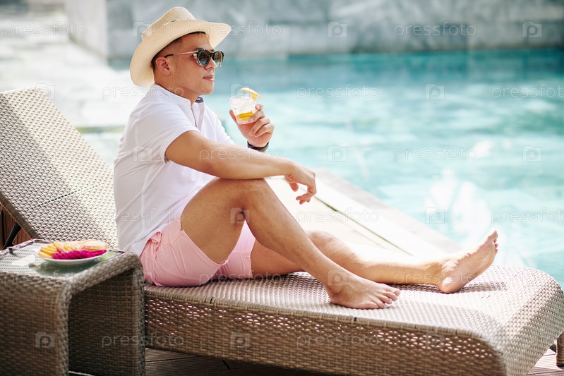 Стильный мужчина отдыхает у бассейна