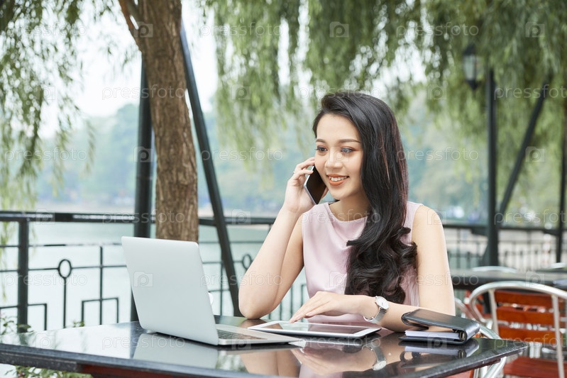 Бизнесвумен в Азиатском кафе под открытым небом