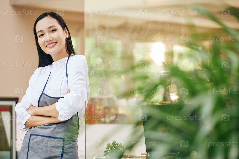 Улыбающаяся официантка смотрит в камеру