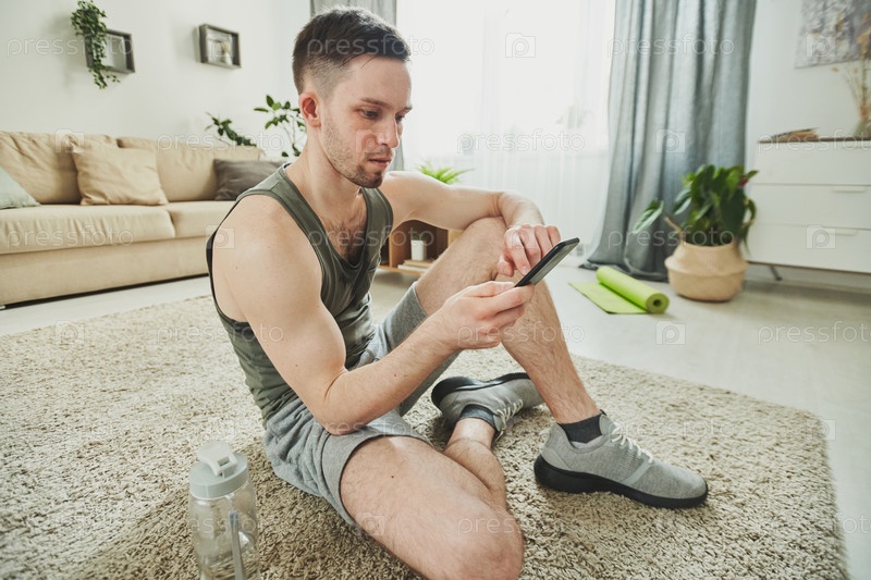Молодой потный спортсмен сидит на ковре и прокручивает сообщения