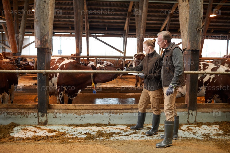 Два работника заботятся о коровах на ферме