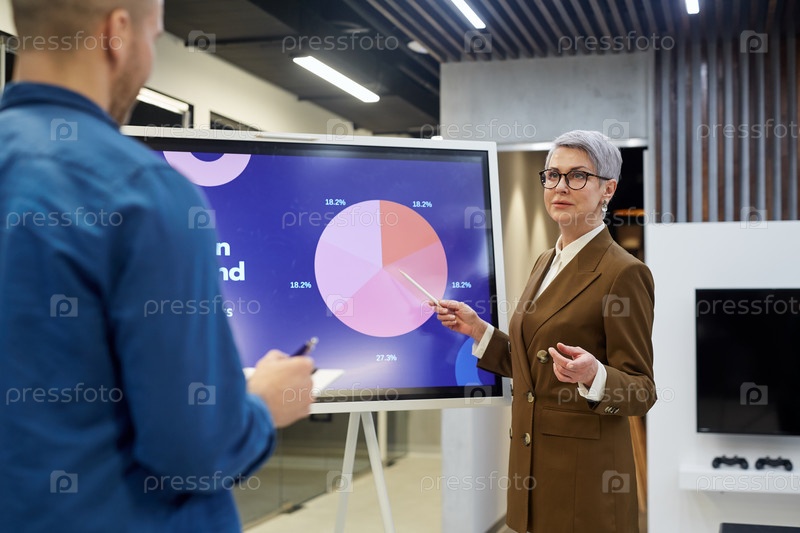 Женщина-менеджер дает презентацию на цифровом экране Matren