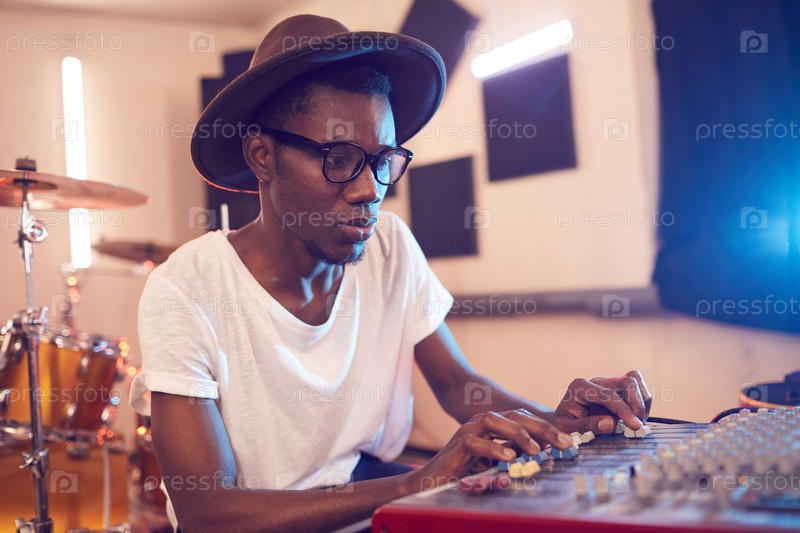 Молодой афроамериканец пишет музыку в студии