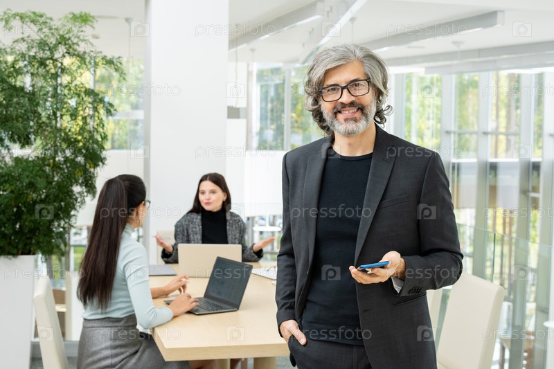 Успешный зрелый бизнесмен в очках и костюме стоит перед камерой