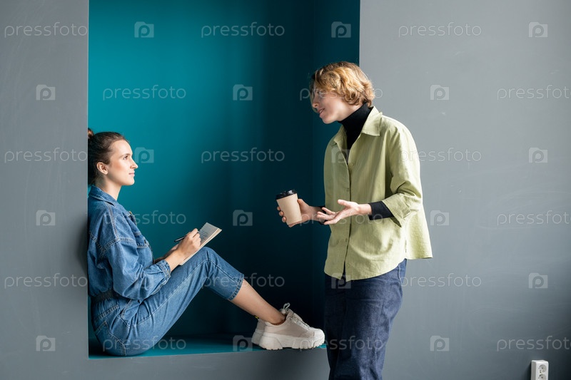 Две современные молодые бизнес-женщины в повседневной одежде обсуждают работу в офисе