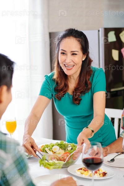Женщина подает салат, который она приготовила
