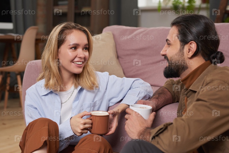 Портрет счастливого молодого человека и женщины, сидящих на полу против дивана в гостиной, пьют чай и говорят о планах на выходные
