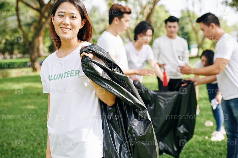 Доброволец собирает мусор в парке