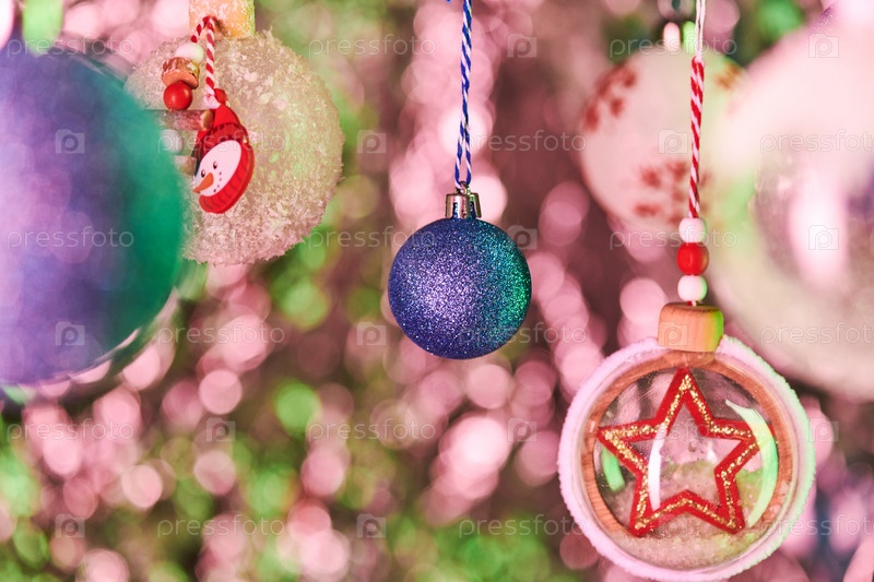 Голубое сферическое украшение и декоративные шары с искусственным снегом и звездой