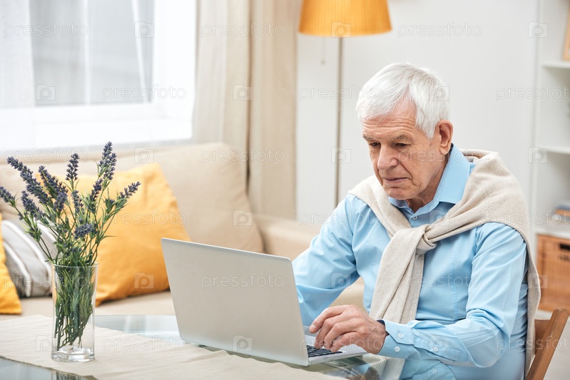 Пожилой мужчина сидит за столом перед ноутбуком во время серфинга в сети
