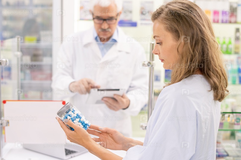 Молодая блондинка-фармацевт просматривает информацию о большой бутылке таблеток
