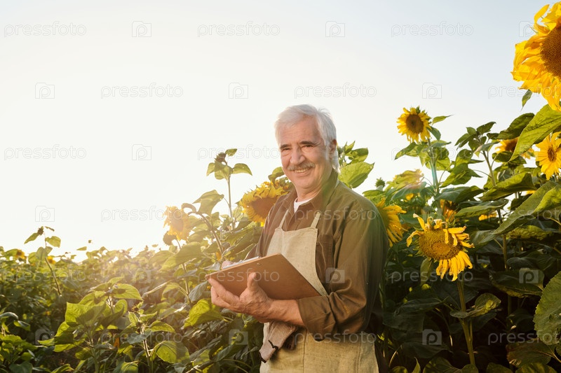 Успешный старший фермер в рабочей одежде смотрит на вас, читая документ
