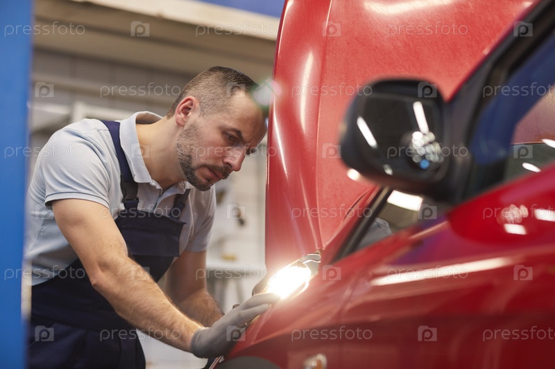 Механик смотрит на автомобиль в автомагазине