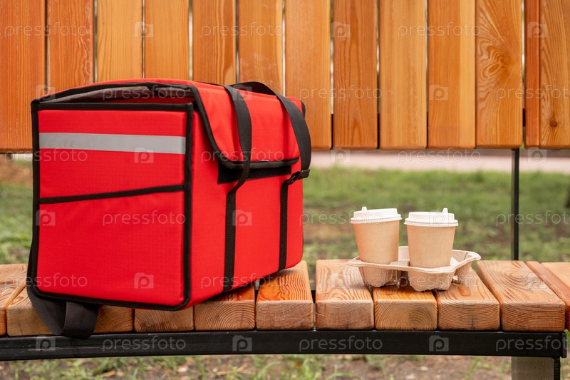 Красный пакет с заказами клиентов кафе или ресторана и два бокала кофе