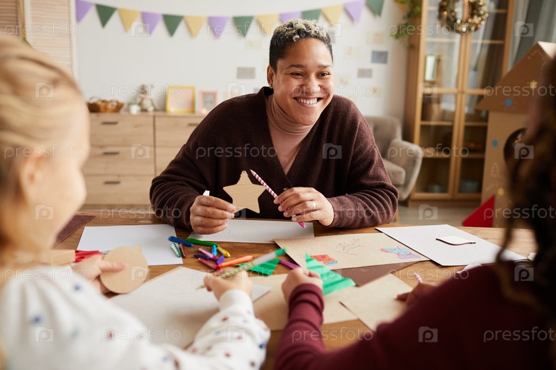 Улыбающаяся учительница наслаждается классом с детьми