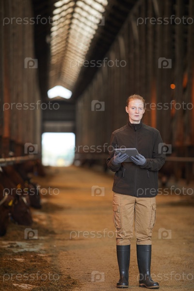 Молодая женщина-работница держит планшет на ферме