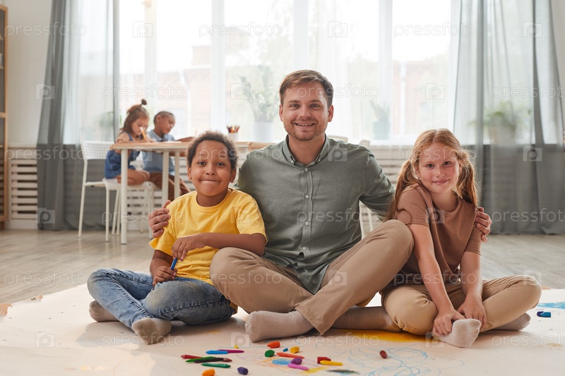 Учительница позирует с улыбающимися мальчиками