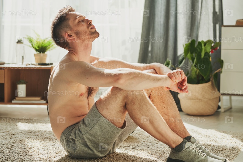 Молодой спортсмен без рубашки в спортивных ботинках и шортах сидит на ковре