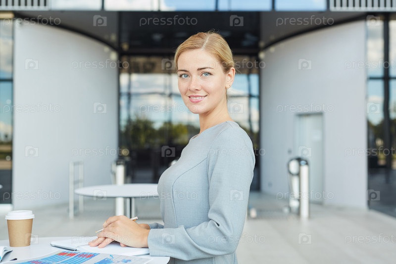 Портрет элегантной деловой женщины, глядящей на камеру во время кофейного перерыва