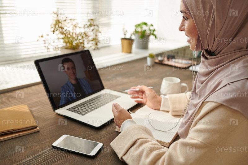 Стильная мусульманка в хиджабе обсуждает вопросы нового бизнес-проекта со своим коллегой с помощью приложения для онлайн встреч